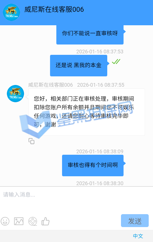2025年1月23日下午我接到他们客服的电话邀请注册,说最高可以领288的彩金,我觉得这个平台不错挺大气的,就充了500元试试水。 因为他们平台我看是要求一倍流水提现,所以我就打到1300元申请了第一次提现,结果失败了,他们客服说让我打注册彩金288的5倍1440元才能提款,我就去他们指定的PG电子去打流水,当天晚上打够流水以后找他们提款再次失败,又改口说要打够提现余额的1300*5倍=6500元的流水才能提现。从第二次给我退回来以后他们给我后台修改了PG电子的赔率,损失从15%提高到50%,我一算账根本不够,然后我就又去打了百家乐,想着输完就不提,赢了就去刷流水,也是运气好,从1300元梭哈到5000多元,回来刷了一晚上的PG电子,一直到1月24日的中午,才刷够流水。1月23日刷了2000多流水亏了300多,差不多15%的亏损,第二天刷了4000多亏损超过2300元,我也没说什么,想着打够就提现吧。然后1月24日我去申请提现,客服先给我提了个88元,然后再提的时候以不足vip1为由让我继续充值700元到vip1,我又充了700,然后又去申请提现,提现后又给我拒绝了,说要我再充值1000元才能使用钱包收款,这回已经引起我的警觉了,我就和他们客服再三确认,这回充1000一定没问题了吧!他们客服拍着胸脯说百分之百一定能提现,给我保证,我就又充了一千。冲进去以后我申请提现又失败了,理由是资金风控让我再充值余额一半的钱也就是4000多元解除风控(我的资金是工资卡没有任何问题),他们客服就变成了复读机,一直让我继续充值,我说什么都没用,我说刚才不是百分之百能提现成功吗?他们也不理我,说这次百分之百能提成功。所以他们平台是输了钱算我倒霉,赢了钱就开始连环套路骗钱的骗子平台 以下是我经过技术手段查到的该平台的所有域名(我本人是计算机科班出身) 威尼斯人: wn88.vip vn600.top vn601.top vn602.top vn603.top vn604.top vn605.top vn606.top vn607.top vn608.top vn609.top vn610.top wn880.top wn881.top wn882.top wn883.top wn884.top wn885.top wn886.top wn887.top wn888.top wn889.top wn890.top wn891.top wn892.top wn893.top wn894.top wn895.top wn896.top wn897.top wn898.top wn899.top vn4456.com vn4457.com 81157.cc 元大娱乐城(同一个主体运营的另一家平台): yd7575.com yd9568.com yd3637.com yd3690.com yd5748.com yd9928.com yd3657.com yd2234.com yd1238.com yd1239.com yd1237.com yd2235.com yd1230.com yd1236.com yd1235.com